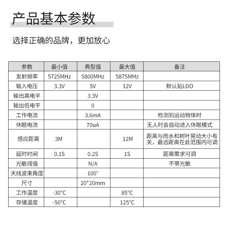 | 传感器类型雷达模块 | 电源电压3.3-12 |